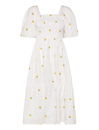 Das gesmokte Oberteil und der Stufenrock verleihen diesem Kleid eine schmeichelhafte Silhouette. Die kurzen Puffärmel verleihen diesem Kleidungsstück für warmes Wetter einen Hauch von Verspieltheit.