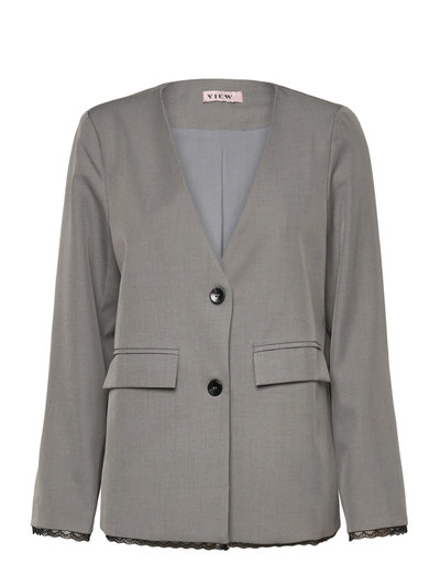 Dieser moderne Blazer besticht durch seine zarte Spitze, die ihm eine feminine Note verleiht. Das Design zeichnet sich durch einen tiefen V-Ausschnitt und einen Zwei-Knopf-Verschluss aus, ergänzt durch vordere Pattentaschen. Der Blazer ist passgenau.
