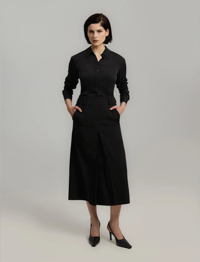 Eine taillierte Silhouette definiert diesen wadenlangen Rock, der durch dezente Faltenakzente hervorgehoben wird. Entworfen mit einem breiten Bund und praktischen Gürtelschlaufen, bietet er eine raffinierte und vielseitige Ergänzung für jede Garderobe.