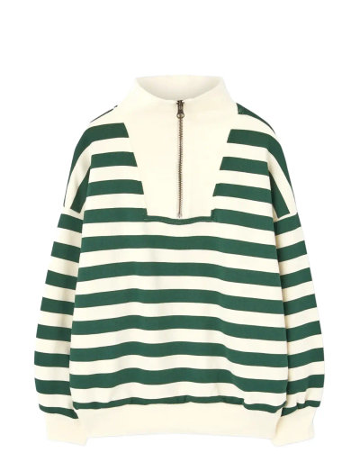 Dieser Pullover mit markanten Streifen und einem strukturierten Reißverschlusskragen bietet sowohl Komfort als auch eine Anspielung auf aktuelle Trends. Der kontrastfarbene Aufnäher sorgt für eine unverwechselbare Note und macht ihn zu einem herausragenden Kleidungsstück für kühlere Tage.
