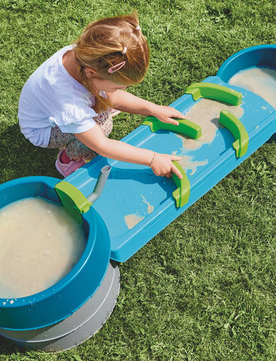 3+ JahreAquaPlay Mudway RUN is an interactive water play track that invites children from 3 years and up to engage in imaginative play with water and mud. The track is made of durable plastic components with gates and flow regulators that control the movement of water – ideal for experimenting and creative roleplay. Mudway RUN is easy to clean and compact for storage. The system is infinitely expandable, and the sections can be individually adjusted to create personalized play landscapes. With a load capacity of up to 50 kg, the track is built to withstand intense play.