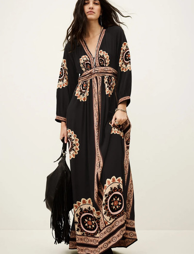Mit ihrer fließenden Silhouette besticht dieses Maxikleid durch einen schmeichelhaften V-Ausschnitt und lange Ärmel. Das Kleidungsstück wird durch aufwendige Details entlang des Oberteils und des Saums aufgewertet und bietet einen Hauch von Bohème-Eleganz.