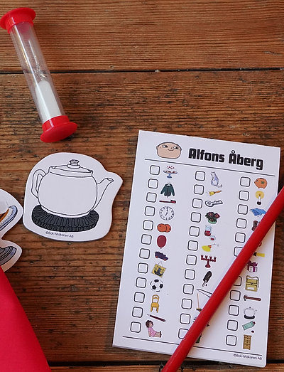 3+ JahreLook and Remember is a fun game that challenges the memory. With closed eyes the “remembering player” must select 8 pieces which is then placed on the table by a co-player. The hourglass is then turn over and now the “remembering player” has to look at the selected pieces and remember as many as possible. Once the time has runned out the accompanying cloth shall be placed on top of the pieces and now the remembering game really begins. Whilst the “remembering player” mentions as many pieces as he or she can remember the co-player has to keep track of the mentioned pieces by looking under the cover. This cute memory game strengthens your child’s memory and helps develop your child's logical sense, observational ability, and concentration. The game is illustrated with cute motif from the Alfie Atkins universe. Barbo Toys products are thoughtfully designed to nurture children’s imagination and support their learning and development.Suitable for children at 3+ years of age.