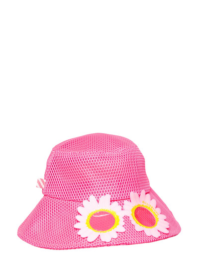 Wabenförmiges Mesh bildet diesen Fischerhut mit breiter Krempe. Er verfügt über eine applizierte Illustration von Blumen mit Sonnenbrille, zusammen mit einem Markenprint und einem gestreiften gewebten Etikett.