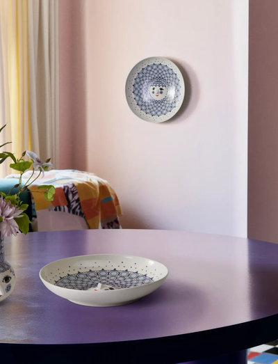 Unfold your colourful personality and make room for joy with Bjørn Wiinblad’s Olga. With her sweet smile, coloured cheeks, and expressive decorations, Olga embodies the very essence of Bjørn Wiinblad as both a person and an artist – even when she takes the form of a large and decorative dish. Cheerful and dreamy, she brings life and personality to any space with her poetic expression and vibrant colours. And with the beautiful and smiling Olga dish from Bjørn Wiinblad in predominantly dark blue shades with light blue tones and pink dots, you can create a whimsical and artistic atmosphere throughout your home. The dish measures 33 cm in diameter and 6 cm in height, making it perfect for serving fresh fruit or as a unique statement piece full of personality and creative expression. But who says a dish has to stay on the table? In true Bjørn Wiinblad spirit, there are almost no limits to where you can place the Olga dish. Use the two holes on the back and hang it on the wall as a stunning decoration that exudes personality and artistic creativity. No matter where you place it, you can fully enjoy the sweet, round face with almond-shaped eyes and the iconic triangular nose – almost the very personification of Bjørn Wiinblad’s art. The Olga dish is made of glossy glazed ceramic with colourful decals, and its decorations are a wonderful fusion of original Bjørn Wiinblad patterns, presented in a delightful blue colour palette that brings a fresh and modern look. Bjørn Wiinblad was a joyful artist with a bold and colourful personality who followed his own path, unafraid to dream big. That very spirit is also deeply felt in Olga, who radiates confidence and invites us to express our own style and personality through expressive decorations inspired by Bjørn Wiinblad’s original artworks. One thing is certain: life is never dull when Olga moves in.
