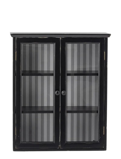 The Hazem Cabinet by Creative Collection is made of black pine with glass doors and a slightly patinated finish. The back is decorated with striped paper that creates a decorative contrast to the dark wood. A versatile cabinet for both storage and display.