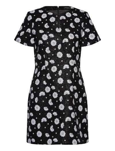 Dieses kurze Kleid besticht durch ein dezentes Blumenmuster und eine raffinierte Silhouette. Das Design verfügt über kurze Ärmel und einen diskreten Reißverschluss auf der Rückseite, der für eine nahtlose Passform sorgt. Ein vielseitiges Kleidungsstück für verschiedene Anlässe.