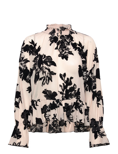 Diese langärmlige Bluse bietet einen Hauch von Eleganz mit einem hohen, gerüschten Ausschnitt und einem sanft ausgestellten Saum. Die fließende Silhouette und die feinen Details machen sie zu einer vielseitigen Ergänzung für jede Garderobe.