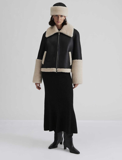 Lamb leather jacket with shearling details. This jacket has a straight fit, pockets and a collar all in shearling lining same as the cuffs and lower part of the jacket.