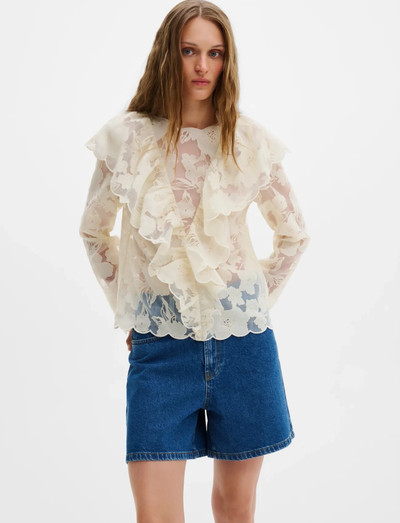 Dieses langärmlige Oberteil aus zarter floraler Spitze besticht durch romantische Rüschendetails. Der geschwungene Saum und der verdeckte Reißverschluss hinten verleihen diesem eleganten Teil einen raffinierten Touch. Fällt größengerecht aus.