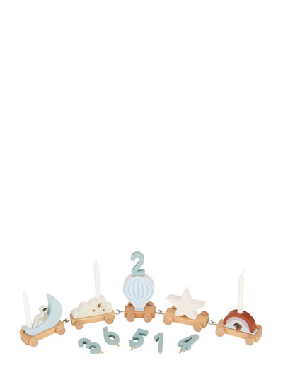 Celebrate your child's special day with this charming FSC-certified Birthday Train. Crafted from natural and painted wood in soft colours, the train features five iconic Cam Cam elements from the beloved Dreamland print: a star, a cloud, a rainbow, a moon with a child sitting on it, and a hot air balloon. Connect the pieces with metal hooks to create a unique setup every year. To mark the birthday of the year, the train comes with wooden numbers from 1 to 6, making it a delightful and reusable centerpiece for early childhood birthdays. The Dreamland Birthday Train is more than just a decoration item — it’s a family keepsake that brings extra magic to your child’s special day and creates lasting memories of sparkling eyes and shared moments of thankful thrill.
