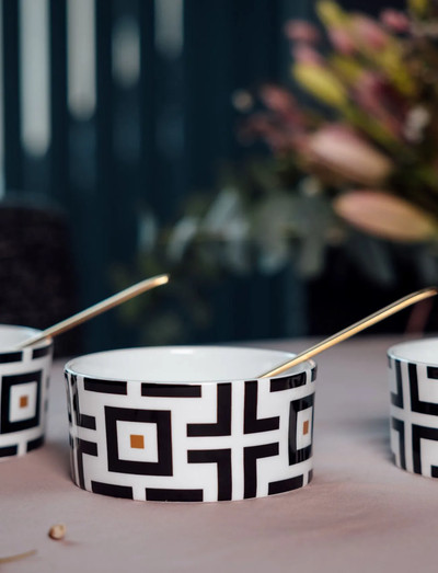 A stylish and cheeky tableware from the artist and designer Carolina Gynning. Set the table with DECO and gild everyday life or make the party something extra. This bowl is excellent as a serving bowl for pick-me-up food and made of bone china. The expressive pattern and elegant emblem were inspired by Carolinas childhood memories of Grandmas porcelain. The pattern is placed by hand, wich makes each part unique and gives the series a genuine feeling.
