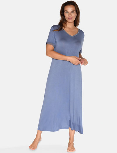 Dieses lange Nachthemd ist auf Komfort ausgelegt und verfügt über kurze Ärmel und zarte Spitzenbesätze am V-Ausschnitt und an den Bündchen. Die lockere Passform sorgt für einen erholsamen Schlaf.