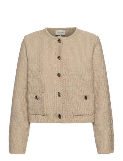Diese kurze Strickjacke zeichnet sich durch ein exklusives Strickmaterial mit fester Knotenstruktur aus. Sie verfügt über abnehmbare Schulterpolster, einen verdeckten Reißverschluss vorne, aufgesetzte Taschen und elegante Schmuckknöpfe. Tragen Sie sie als kurze Jacke zu Jeans für einen coolen Look.