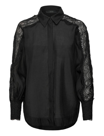 Dieses langärmlige Hemd ist aus einem hochwertigen Material gefertigt und verfügt über zarte Spitzendetails an den Ärmelbündchen. Ein verdeckter Knopfverschluss auf der Vorderseite und strategisch platzierte Cut-and-Sew-Spitze bieten einen dezenten Blick auf die Haut.