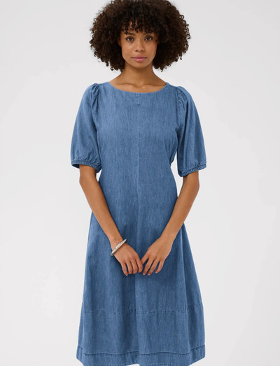Dieses Kleid aus leichtem Denimstoff hat kurze, Puffärmel und einen klassischen Rundhalsausschnitt. Die gerade Passform und die Einsätze am Saum sorgen für eine zeitlose Silhouette.