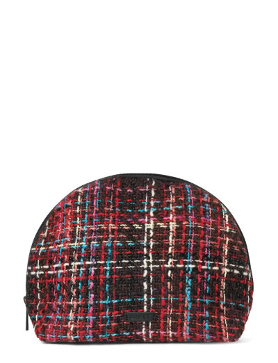A medium-sized pouch made from multicoloured bouclé fabric with an oval shape and structured base. It closes with a zip and features a light twill lining with a practical zip pocket. Ideal for organising everyday essentials – whether at home or on the go.