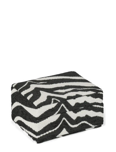 This small jewellery case features a jacquard-woven zebra pattern and a soft black velour interior. It has a magnetic closure and includes necklace hooks and multiple compartments for organised storage.