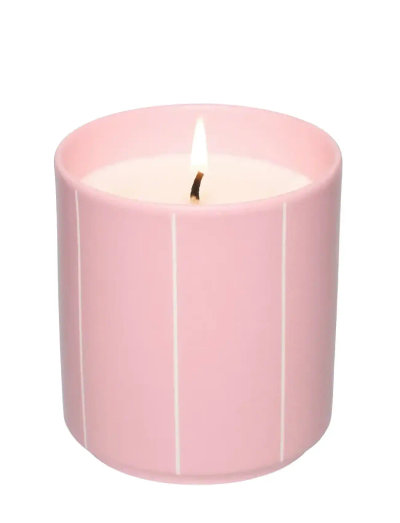 Delicious pink scented candle with a fresh. floral scent with notes of lemon and fresh flowers. Comes in a beautiful reusable matt glazed porcelain cup with engraved stripes.