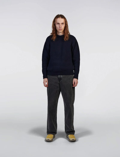 Dieser Strickpullover aus einem robusten Wollgemisch bietet Wärme und eine markante, kastenförmige Silhouette. Das Design zeichnet sich durch ein auffälliges Jacquard-Detail auf der Rückseite aus, das künstlerisches Flair mit praktischer Konstruktion für kühleres Wetter verbindet.