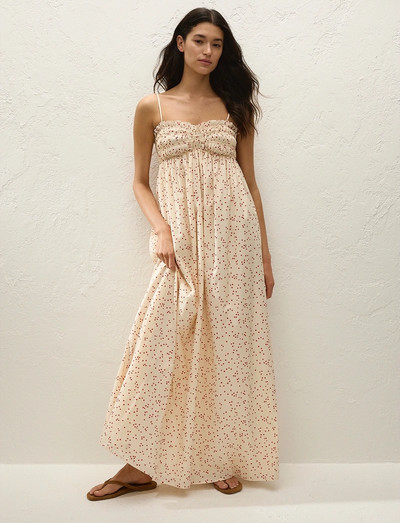 Dieses Maxikleid aus leichtem Baumwollstoff bietet einen mühelosen Stil. Es verfügt über dünne, verstellbare Träger und ein elastisches Brustdetail, das eine bequeme und schmeichelhafte Passform gewährleistet. Die Empire-Linie geht in einen gerafften A-Linien-Rock über, der durch ein vollständiges Futter ergänzt wird.