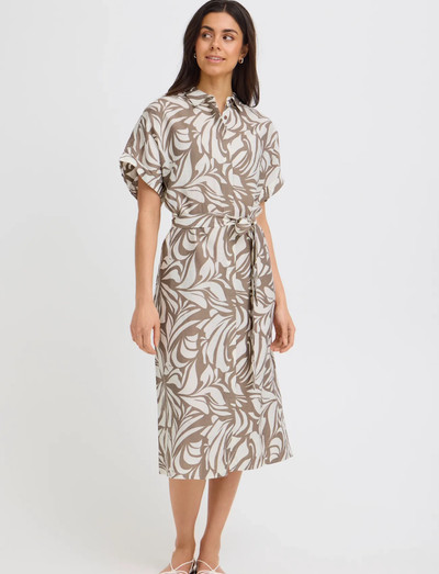 Ein Bindegürtel betont die Taille dieses Midikleides und sorgt für eine schmeichelhafte Silhouette. Der Allover-Print sorgt für einen optischen Hingucker, während die hochgekrempelten Ärmel für ein entspanntes Tragegefühl sorgen.