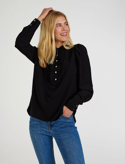 Leichter Stoff und eine entspannte Passform zeichnen dieses langärmlige Hemd aus. Es verfügt über einen charmanten Rüschenkragen mit Druckknöpfen und elegante Puffärmel, die mit Knopfmanschetten abschließen.