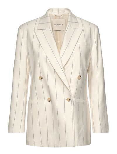 Dieser elegante Blazer besticht durch sein zeitloses Nadelstreifen-Design. Er verfügt über einen doppelreihigen Verschluss und einen klassischen Revers. Der Blazer ist aus einer luxuriösen Leinenmischung gefertigt. Er bietet eine bequeme Passform und einen raffinierten Look.