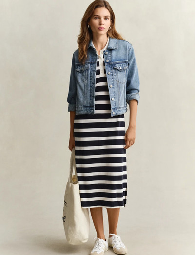 Dieses knielange Kleid präsentiert sich in einem klassischen Streifendesign und bietet eine bequeme, reguläre Passform. Ein flach gestrickter Kragen und eine gerippte Knopfleiste verleihen diesem lässigen Kleidungsstück einen Hauch von Eleganz. Ideal für den Alltag.