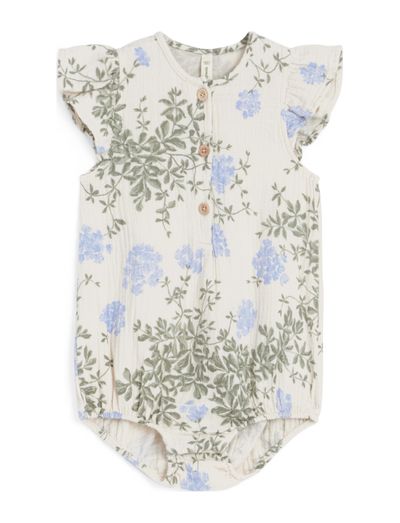 Made in double layer cotton muslin with soft handfeel. This balloon shaped romper is designed with delicate frill details, wooden buttons at front and hidden snap buttons at the crotch for easy dressing.