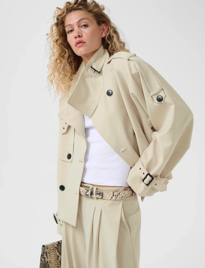 Dieser kurze Trenchcoat mit zweireihiger Knopfleiste und hohem Kragen verleiht einem klassischen Design eine moderne Note. Die Ärmelriegel und Seitentaschen sorgen für funktionelle Details und machen ihn zu einer stilvollen und praktischen Wahl für die Übergangszeit.