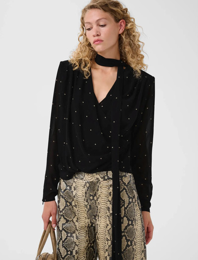 Diese Bluse mit hohem Halsausschnitt und Schlüssellochdetail vorne bietet eine elegante Note. Sie verfügt über lange Ärmel und einen Selbstbinderverschluss, der das elegante Design unterstreicht.