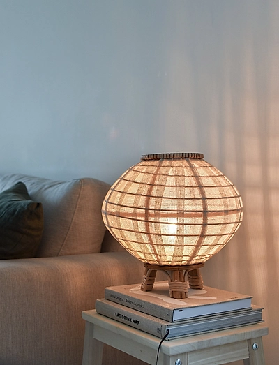 Tropical greenery, a rush through the palm leaves and the waves that open and fold like a blanket over the milelong white beach. there at a small café, among bamboo furniture and seaweed parasols, stands this decorative table lamp. the lamp is made of natural colored rattan and offwhite linen fabric. the lamp has a 200 cm long white textile cable with a switch and europlug. n.b! this item is for indoor use only.width: 30 depth: 30 height: 37 (cm ).lamp holder: 1xe27 60w.