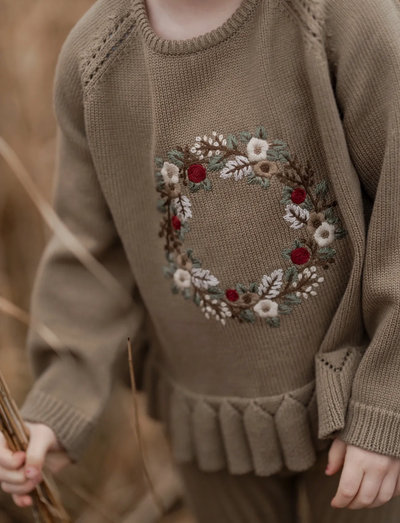 Diese Strickbluse bezaubert mit einem handgestickten Winterkranz auf der Vorderseite. Sie hat eine bequeme, lockere Passform und einen feinen Rocksaum. Ein Knopfverschluss dient zum Schließen auf der Rückseite.