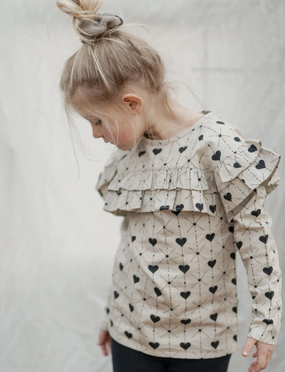 Diese langärmlige Bluse aus weicher Baumwolle besticht durch ein charmantes Herzmuster. Rüschen zieren den runden Ausschnitt und verlaufen anmutig über Brust und Schultern.