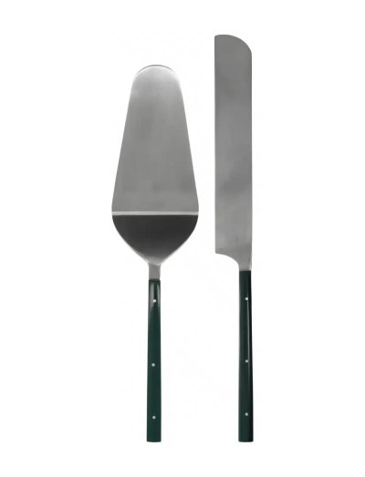 The HDLata set features two stainless steel cake servers, a spatula and a cake knife, with polished blades and green handles.