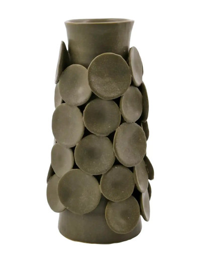 This khaki stoneware vase features handcrafted decorative circles that transform it into a sculptural art piece for your home. The matte surface and artistic details bring depth and character to any table, shelf, or console.