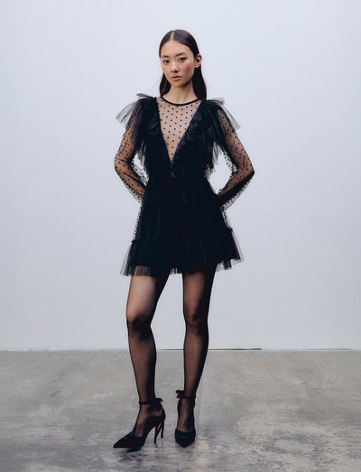 Dieses Minikleid aus beflocktem Punktetüll besticht durch verspielte Rüschen für einen Hauch von Laune. Das Design verfügt über lange Ärmel und eine schmeichelhafte Silhouette, was es zu einer herausragenden Wahl für Partys oder besondere Anlässe macht.
