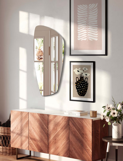 Organic mirror in clear glass, in a minimalist design. the mirror can be hung on both joints and fits in all rooms.