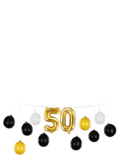 3-in-1 balloon garland with gold, black, and white latex balloons (10 total), two gold-colored number foil balloons, and a 25-meter-long string. Includes assembly instructions and a straw for inflating the balloons. You can also use a balloon pump. The garland measures approximately 260 x 32 cm when assembled.