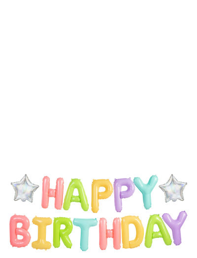 The package contains air-filled foil balloon letters spelling out the text HAPPY BIRTHDAY, along with two star-shaped foil balloons. The balloons can be filled with air using a balloon pump and have hanging loops at the top and bottom. The letters are 35 cm high, and the full text length is 395 cm.