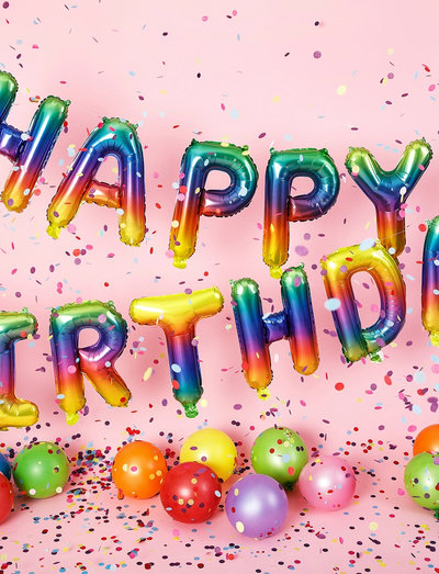The package contains air-filled foil balloon letters spelling out the text HAPPY BIRTHDAY. The balloons can be filled with air using a balloon pump and have hanging loops at the top and bottom. The letters are 35 cm high, and the full text is 340 cm long.