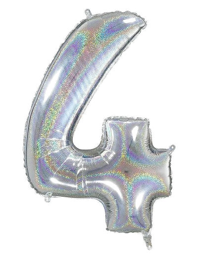 3+ JahreFoil balloon with holographic silver surface, number 4. Inflated size approximately 52 x 72 cm. The balloon can be filled with helium and will float for about a week. It can also be filled with air using a balloon pump and hung up with, for example, fishing line. The balloon has hanging loops at the top and bottom as well as an automatic valve for easy filling. It can also be emptied with a straw and refilled.