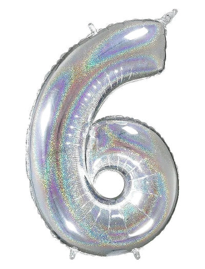 3+ JahreFoil balloon with holographic silver surface, number 6. Inflated size approximately 49 x 72 cm. The balloon can be filled with helium and will float for about a week. It can also be filled with air using a balloon pump and hung up with, for example, fishing line. The balloon has hanging loops at the top and bottom as well as an automatic valve for easy filling. It can also be emptied with a straw and refilled.