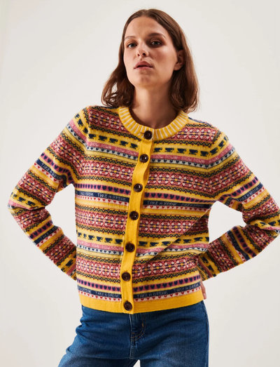 Diese Strickjacke aus einem weichen Wollgemisch besticht durch ein charmantes Fair-Isle-Muster. Kontrastfarbene Knöpfe dienen zum Schließen der Vorderseite, während der klassische Schnitt sie ideal zum Layern macht. Ein runder Ausschnitt vervollständigt dieses Kleidungsstück und verleiht jedem Outfit Wärme und Persönlichkeit.