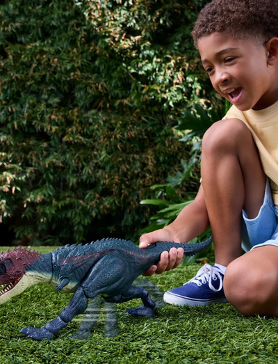The Jurassic World Charge 'N Chomp Carnotaurus dinosaur toy has a thrilling running and chomping motion as well as roar sounds. The multi-jointed legs move in a realistic charging run, activated by a button at the base of the tail. The running pounce sets it on offense and the chomps provide defense. This multi-featured dinosaur toy is ready for battling fun. Scan the Tracking Code on the dinosaur's foot in the free Jurassic World Play App with a compatible smart device (Android or iOS, not included) to unlock a digital version of the dinosaur and play the fiercely fun game to race vehicles on land, air and sea. Suitable for dinosaur fans ages 4 years and up. Multiple species are available, each sold separately, subject to availability. Colours and decorations may vary.