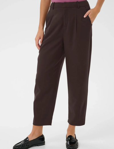 The KAmerle pants are a casual pair of suit pants with cropped legs that are cut right below the calves. The pants are high-waisted with a regular waistband and pleats at the front. They have jetted back pockets and hidden front pockets. The fit of the pants is regular with tapered legs.