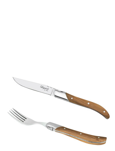Steak knives and forks Laguiole is neither a trademark nor a company name, Laguiole is a name that is associated with the special shape that the traditional knives have. It dates back to the 19th century. Laguiole originate from the Massif Central in France from the small village of Laguiole - hence the name. Steak knives and forks with handles made of Olive wood, and 420 Stainless steel with a cicada logo. Presented in a nice black wooden box.