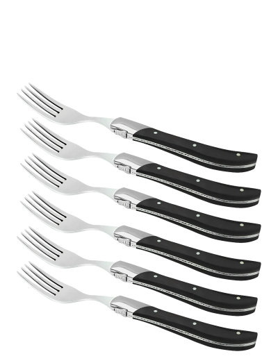 Steak knives and forks Laguiole is neither a trademark nor a company name, Laguiole is a name that is associated with the special shape that the traditional knives have. It dates back to the 19th century. Laguiole originate from the Massif Central in France from the small village of Laguiole - hence the name. Steak knives and forks with handles made of Ebony, and 420 Stainless steel with a cicada logo. Delivered in a black wooden box.