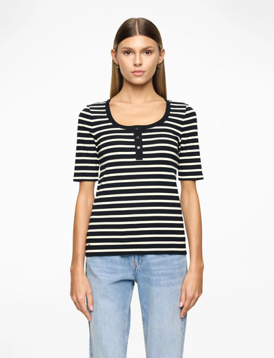 Rib-knit with soft, stretch-infused cotton, this slim-fitting Henley top is characterized by elbow-length sleeves and yarn-dyed horizontal stripes. An “LRL”-embroidered logo and “LRL”-engraved buttons add a signature finish.Slim fit. Intended to hit at the hip.Size medium has a 24" body length and an 11" sleeve length. Body length is taken from the high point of the shoulder. Sleeve length changes 0.25" between sizes.Scoopneck. Three-button placket. Buttons custom-developed with an "LRL" logo